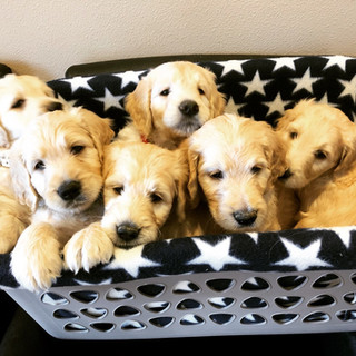 Yesterday, the group saw Dr. James for their big appointment! All six puppies received a complete wellness exam, first shot, a second round of dewormer, and their microchips! They are getting so big everyday and this week started eating a mix of their wet gruel AND dry food! (Changing up their food to include the dry food didn't slow these babies down at all!) Dr. James says everyone is in picture perfect health by way of heart, lungs, joints, stomach and coat. Monica weighed in the smallest at just under 10 lbs and Ross weighed almost 13! Gunther, Chandler, Joey and Rachel all had weights falling right around 11lbs! These babies are growing quick! -- On a side note, Chandler, our last remaining male has found his forever family!